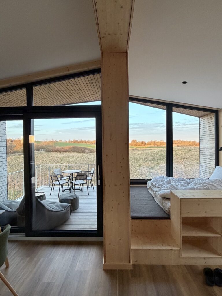 Ganz egal, für welche Kategorie du dich entscheidest: Das Herzstück aller Unterkünfte sind die großen Panoramafenster. Sie verwandeln jeden Raum in ein lebendiges Gemälde: Morgens beim Kaffee zieht ein Hase über die Wiese, Vögel kreisen im Wind und irgendwo kräht ein Hahn.